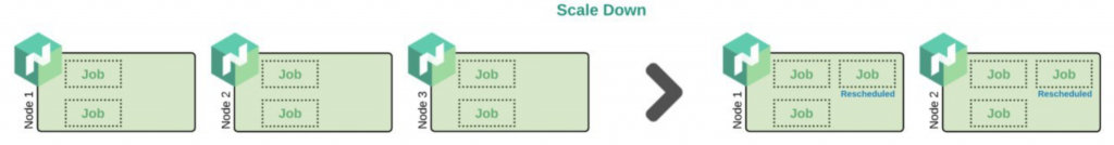 Nomad Autoscaler monitors the usage of all nodes. If a node is not needed for an extended period and is not highly utilized, the Jobs will be scheduled elsewhere and the node will be terminated.