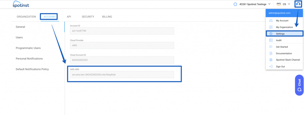 You can find your Spot cross-account IAM role in the Spot settings in the Account menu.